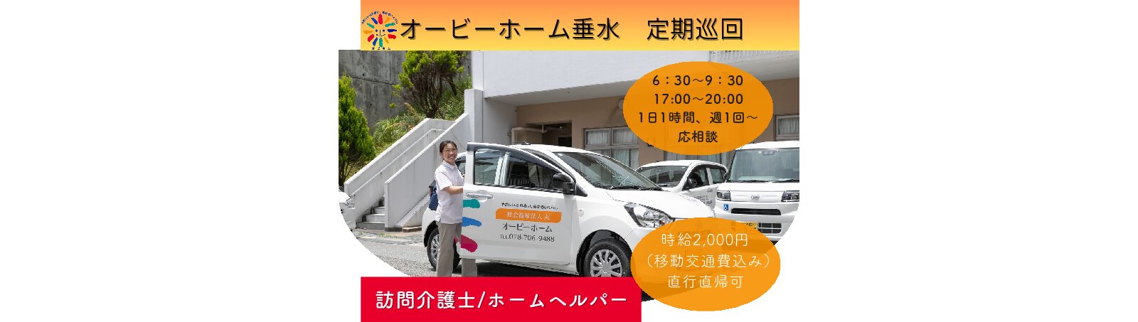 【オービーホーム垂水 定期巡回/アルバイト・パート】定期巡回の介護職 ヘルパー/時給でお支払い♪1日1時間~短時間バイト!直行直帰可‼